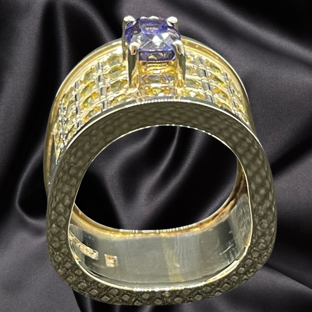 One 18Kt white Palladium blend lady’s “Custom Handmade” “EDUARDO PELEGRIN” Designed Natural Tanzanite and Natural Yellow Sapphire ring, measuring 14.25mm {at the top of the ring) tapering to 11.65mm (at the base of the shank). The ring features a central raised hand-made 4 claw setting, with 4 rows of bead settings that go across the top of the ring, with an 18kt white rectangular stirrup-shaped band with raised 18Kt white gold border rails, with a solid drilled underside, a high polished finish, stamped 18K PELEGRIN on the inside of the ring, set with: