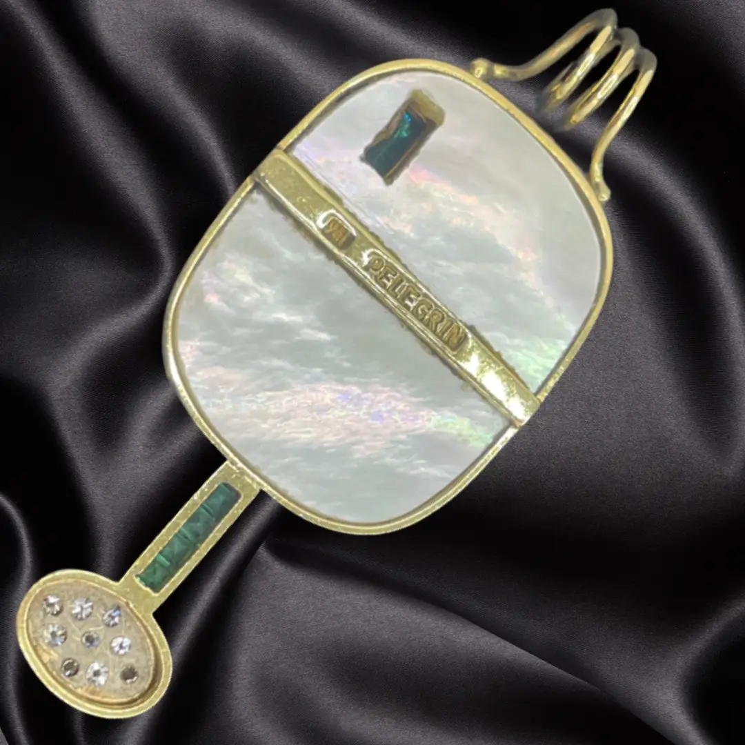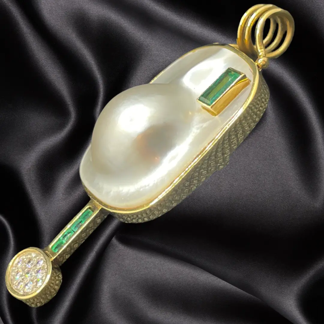 One 18Kt yellow gold lady’s “Custom Handmade” “EDUARDO PELEGRIN DESIGN” Saltwater Cultured Blister Pearl, Diamond and Columbian Emerald pendant, handmade assembled and finished, measuring 60.00mm (total length) 25.00mm (width). The pendant features a handmade cushion bezel with a rectangular bezel setting off to one side cut into the Blister pearl and epoxied in place, with a rectangular channel set formation a the base with an oval pave set white gold insert in an 18Kt yellow gold oval bezel in a horizontal configuration, with an open drilled back, a high polished finish and a handmade coil bail with granulated terminations, stamped PELEGRIN 18K.