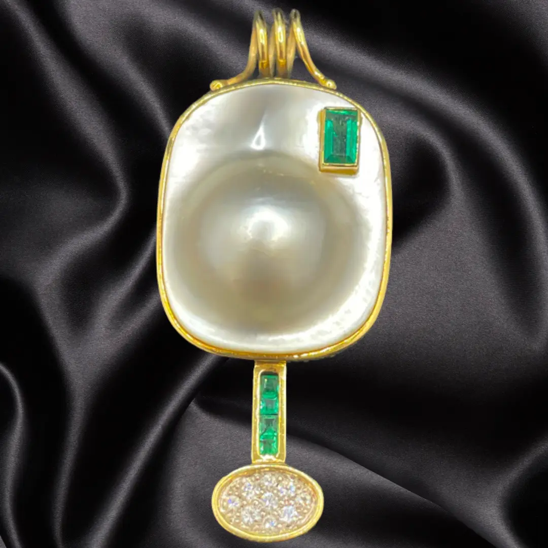One of a Kind Custom Handmade Legacy Eduardo Pelegrin Design = Saltwater Cultured Blister Pearl, Diamond and Columbian Emerald pendant.