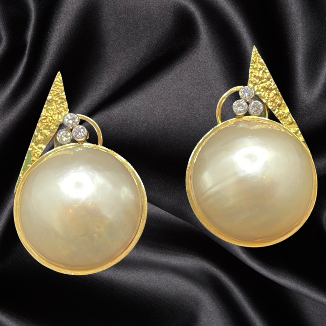 One pair of 18Kt yellow gold lady’s “Custom Handmade” “EDUARDO PELEGRIN” Design, Saltwater Cultured Mabe Pearl and Diamond earrings. Each earring features a faux round bezel setting with a rectangular support bar in the back, with three multi-tiered tubular 18Kt white gold bezel setting in a triangular formation at the top of the bezel with a scalene triangular offset at the top, with a melted gold texture, a high polished finish and is secured by a medium weight earring post and hinged omega back, stamped around the central bezel 18K PELEGRIN. Each earring is set with: